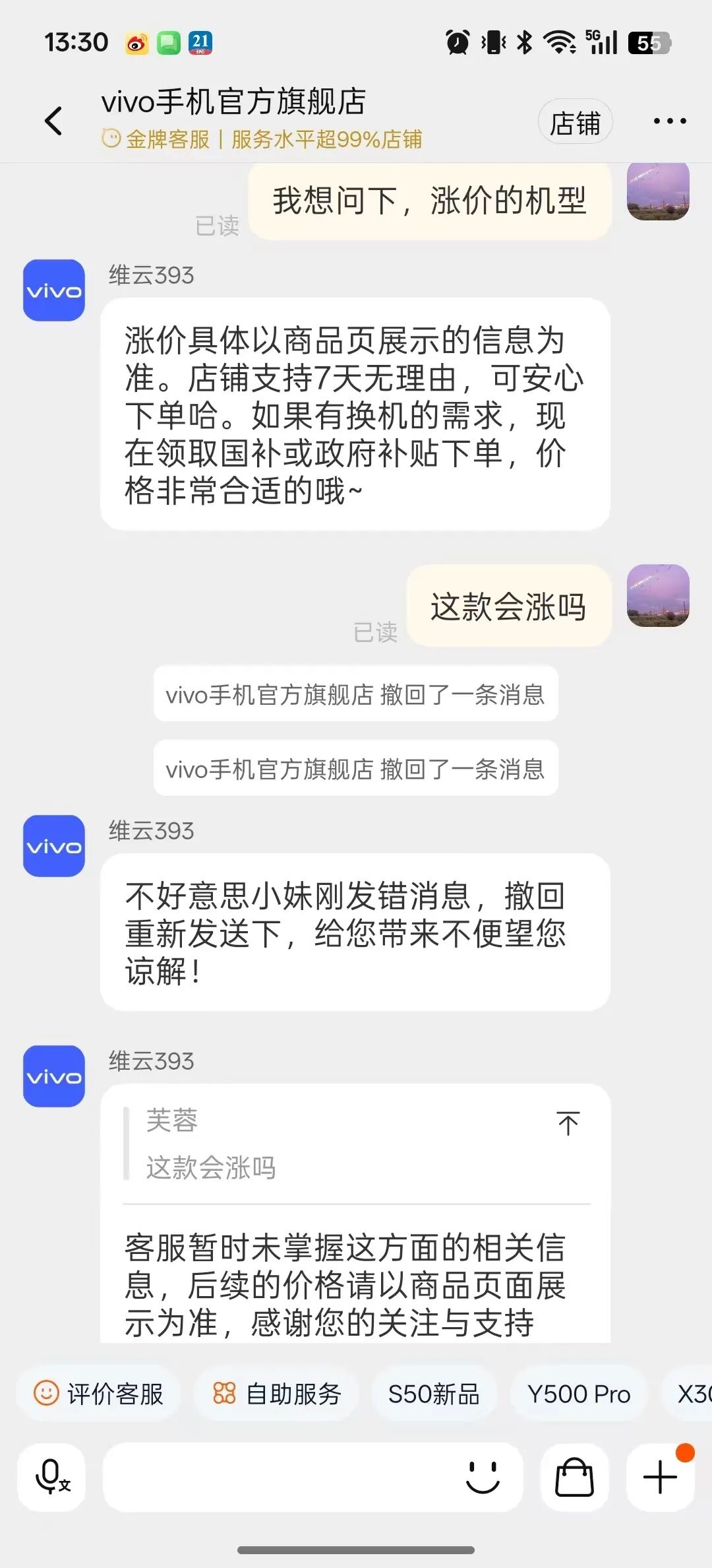 记者随后在各大线上购物平台咨询vivo、iQOO官方客服,对方证实了涨价消息,仅表示具体调价机型及涨幅尚未明确,后续将以商品页面展示为准。
