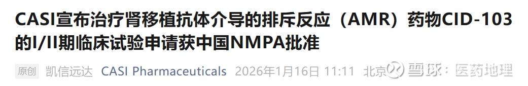 1月16日,凯信远达(CASI)宣布,其抗CD38单抗CID-103用于治疗活动性和慢性活动性同种异体肾移植抗体介导的排斥反应(AMR)的临床试验申请(CTA)获中国国家药品监督管理局(NMPA)批准。该I/II期临床试验为剂量探索及安全性研究,旨在评估CID-103在肾移植AMR成人患者中的耐受性与疗效。