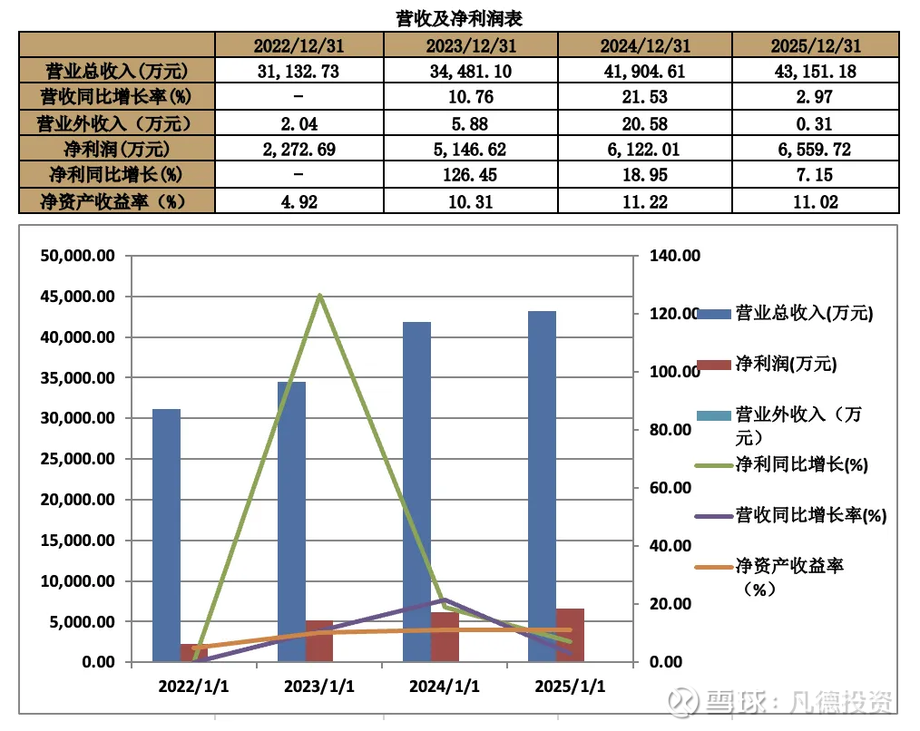 业绩情况:2022-2025年底,公司的营业收入分别为31132.73万元、34481.1万元、41904.61万元、43151.18万元,年均复合增长率达到 11.50%;归母净利润分别为2272.69万元、5146.62万元、6122.01万元,6559.72万元,年均复合增长率达到 42.38%。