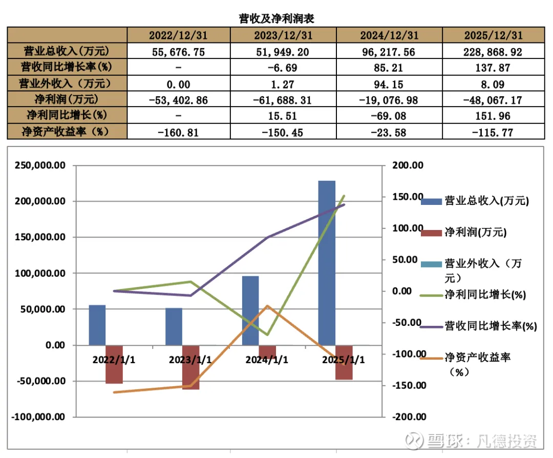 业绩情况:2022-2025年底,公司的营业收入分别为55,676.75万元、51,949.2万元、96,217.56万元、228,868.92万元,年均复合增长率达到 60.19%;归母净利润分别为-53,402.86万元、-61,688.31万元、-19,076.98万元,-48,067.17万元。