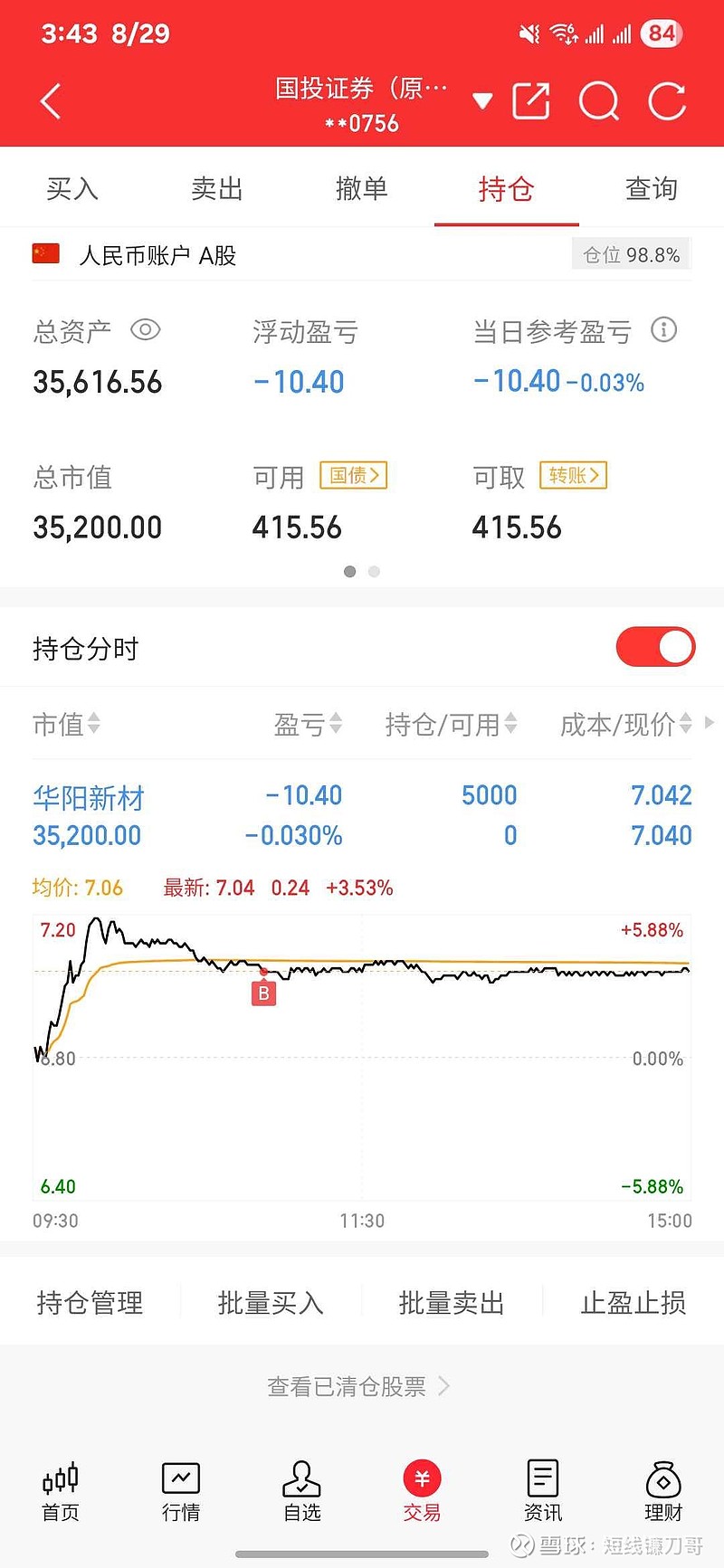 7.04,收盘也是7.04,没波动目前是感觉这支票明天会有溢价,所以就入了。目前总盈利15616.56,离本金翻倍只差一个半的涨停板。