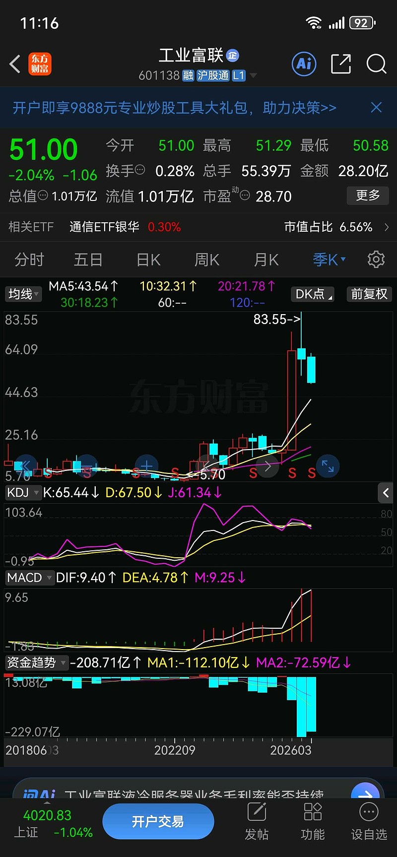关于工业富联说几句,我也有小仓位去年拿到现在,然后大部分小散拿了这半年,你们对这个家上市公司有多少了解!今年明年的成长性又如何?难道只知道买了这个股票半年,你很难受???从历史季k线,2023年至今,一次两个季度调整,一次三到四个季度调整,这一次现在是两个季度调整。