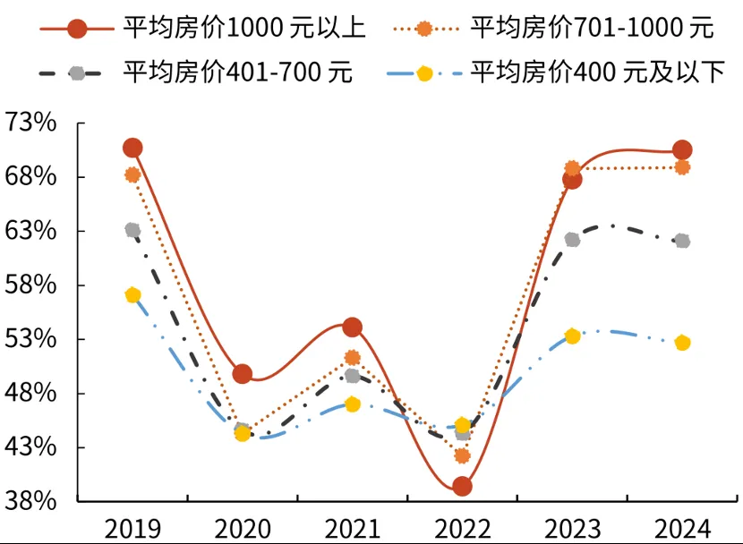 上图为不同价格带酒店的出租率情况,2024年之后不同房型酒店(尤其高档酒店)出租率均已达到或接近2019年水平,也就是说出行市场的回暖使酒店业的需求侧是比较旺盛的,降价去库存的动机理论上不大。