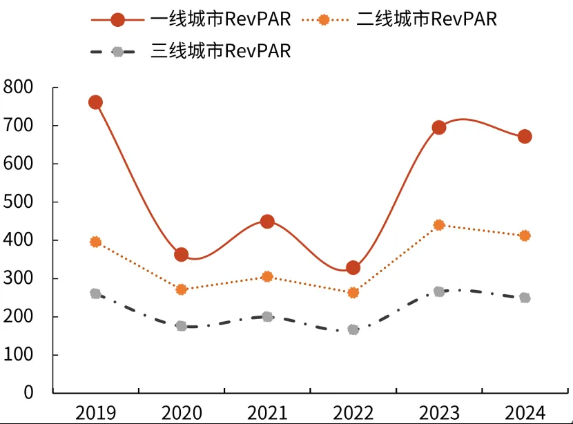 ADR=总客房收入/已售客房数量。在社会经济秩序完全恢复的2023年,该指标出现了明显回弹的势头,不过在第二年的2024年又呈现了明显下滑的趋势,考虑到此时全国出行人数已在持续反弹,酒店平均房价却不升反降,这是非常反直觉的。
