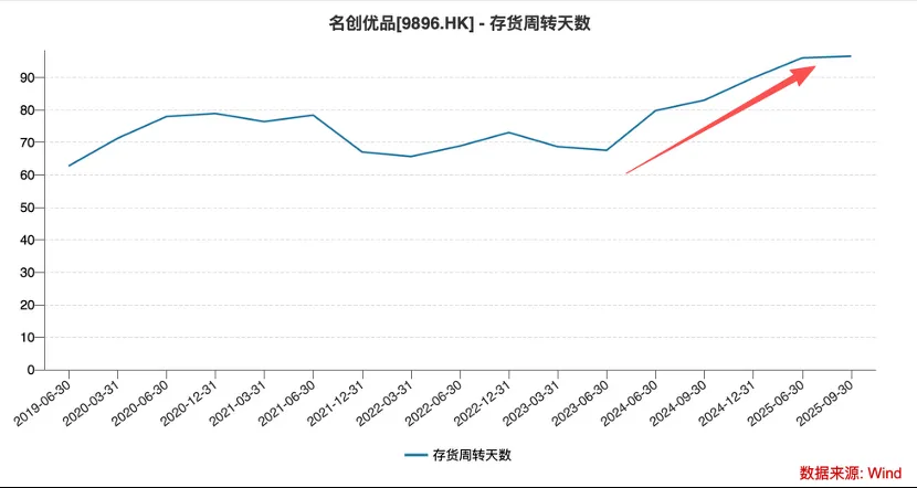 2023 年之后,随着同店GMV 增速的放缓,名创优品库存周转天数有了明显的上移(与前文分析基本一致),2025年之后更是超过了90天,1800 个SKU的推出一部分是以牺牲库存效率获得的,不过Q2 之后,库存周转天数增速明显变化,Q3 环比几乎没有变化,某种程度上零售渠道的改革确实止住了效率下滑的态势。