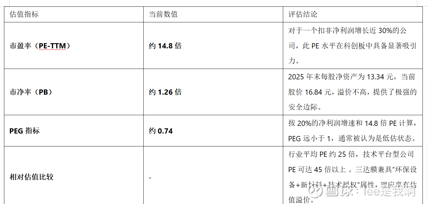 三达膜是一家基本面扎实、战略清晰的科创板公司。其核心投资逻辑在于:水务运营(现金牛)提供安全边际 + 膜技术应用(成长引擎)打开想象空间。尤为重要的是,公司所处的工业料液分离赛道,是“十五五”国家重点发展的合成生物学/生物制造产业中,解决“分离纯化”这一核心痛点的关键环节。公司扮演的是整个生物制造产业不可或缺的“卖水人”角色。当前估值(PE约14.8倍,PB约1.26倍)在考虑了其成长性与战略地位后,具备显著的低估特征和较高的安全边际。