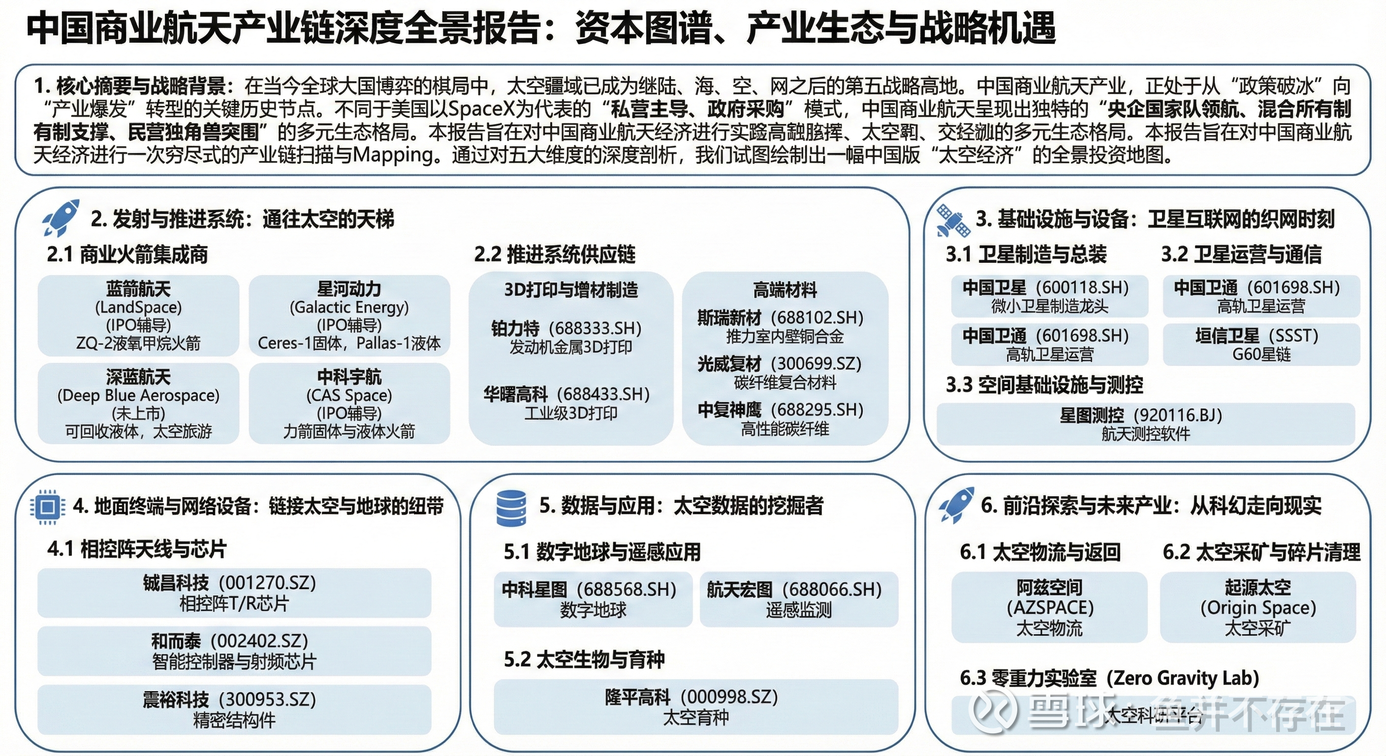这是我对中国商业航天经济进行一次穷尽式的产业链扫描与Mapping。不仅关注那些在聚光灯下的火箭发射与卫星制造企业,更深入挖掘产业链上游的隐形冠军——那些为大国重器提供“心脏”材料、神经芯片以及精密制造能力的上市公司。分了几个模块:发射与推进(Launch & Propulsion)、基础设施与设备(Infrastructure & Equipment)、支持产业(Support Industries)、数据与应用(Data & Analytics)以及太空前沿(Space Frontier)通过对这五