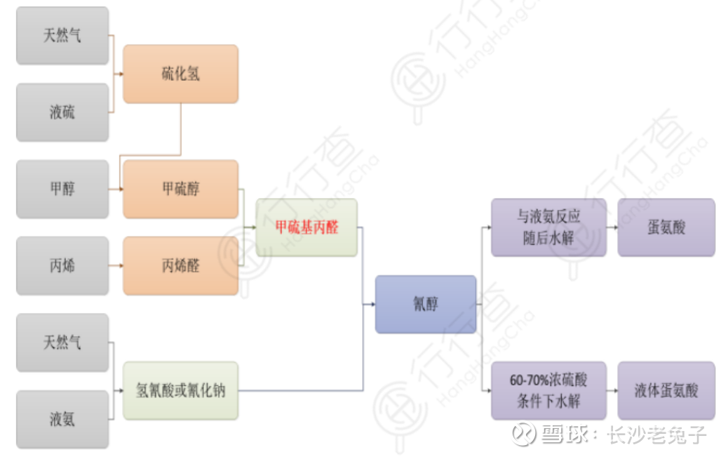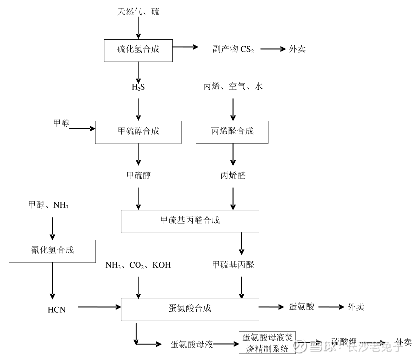 生产链:重要原材料为丙烯、甲醇、天燃气和硫产品等。在生产过程中产生的一些多余的中间体,如硫酸、二硫化碳等将被销售到市场上。产成品则是固体蛋氨酸、液体蛋氨酸以及硫酸钠和硫酸铵副产品。高危险性中间体主要包括甲醇、甲硫基丙醛、硫化氢、氢化氰等化学材料。