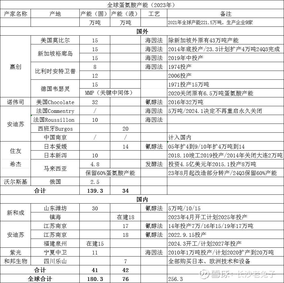 安迪苏:总产能65万吨位列全球第二,其中液态产能35万吨列全球第一。2009年总产能25万吨。2023年报:诺伟司于2020年7月29日在美国提交了关于自法国、日本和西班牙进口蛋氨酸反倾销税的申请。 该诉讼的最终裁决为对西班牙生产并出口到美国的液体蛋氨酸征收36%的税。…公司已决定停止从法国出口固体蛋氨酸到美国,并将这部分有限的产品销往其他地区和国家。…2024年1月,为了提高蛋氨酸业务的整体成本竞争力,安迪苏决定永久关闭Commentry固体蛋氨酸生产线。本公司于2023年计提相关预计负债。