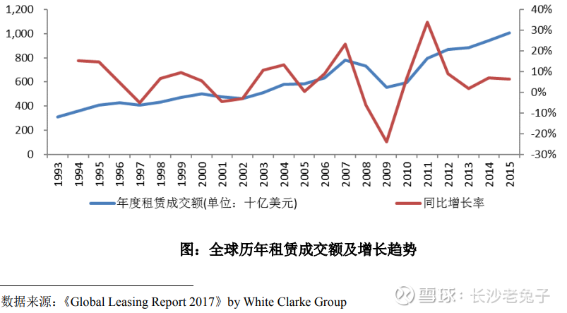 1952年,世界第一家融资租赁公司在美国成立,掀开了现代融资租赁业的发展历程。据《世界租赁年报》统计,从全球租赁成交额来看,1993年至2015年总体保持平稳增长,1993年租赁成交额3,096亿美元,2015年为10,053亿美 元,年均复合增长率 5.50%。