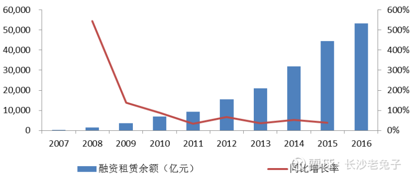 2007年后,国内融资租赁业进入了几何级数增长的时期。业务总量由2007年的约240亿元增至2016年约53,300亿元,年均复合增长率为82%。2016年末我国的融资租赁余额较 2015年末上升 20%。