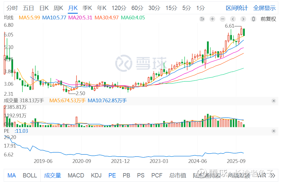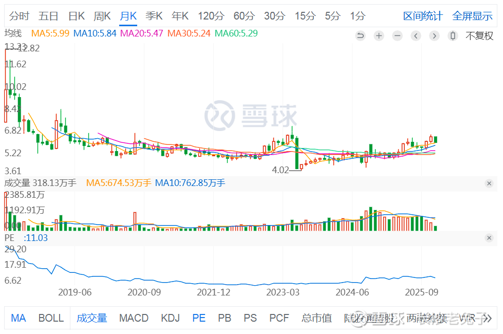 20251020于5.79买入观察仓,PE=9.34、PB=1.39,估值合理偏低;股息率=4.66%,股息率低于5%,可以接受。不过在当前持仓股中不具备优势,主要是由于去年债转股的因素导致每股分红下降,但基本可以确定预期3~5年的中短期内业绩具备年复合增长达到10%以上,5~10年的中长期内可以保持5%以上的年复合增长。