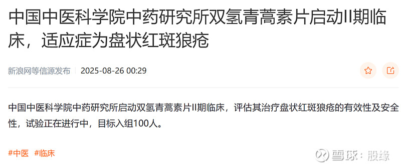 中国中医科学院中药研究所双氢青蒿素片启动II期临床 适应症为盘状红斑狼疮。