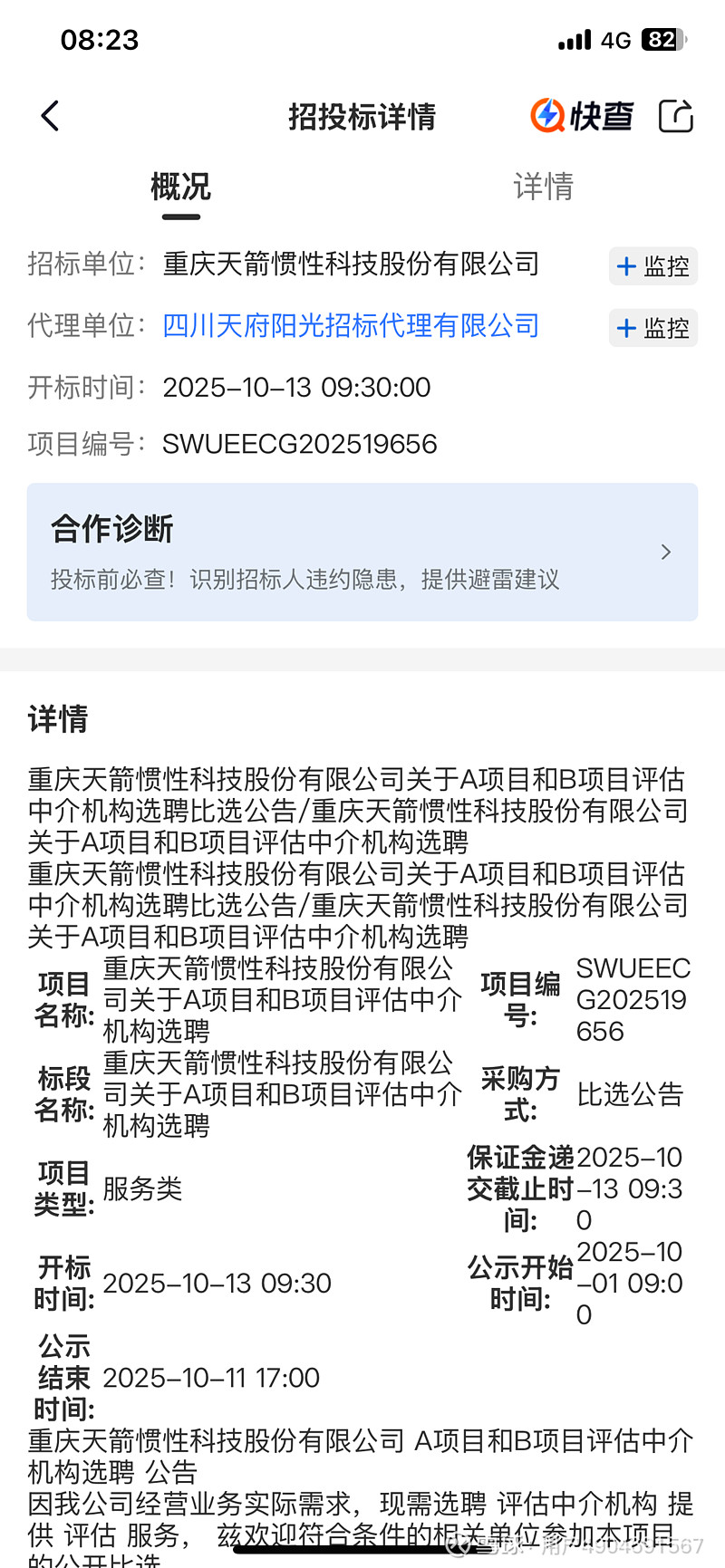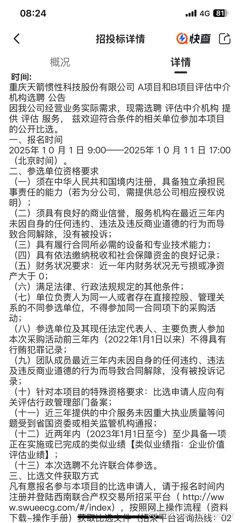 重庆天箭此次针对A、B项目选聘评估中介机构,核心目的是对项目进行企业价值评估。结合四川发展在航空航天领域的资本运作逻辑(如控股收购天箭惯性、布局商业航天产业链),这类评估通常是资产注入、并购整合的前置动作。
