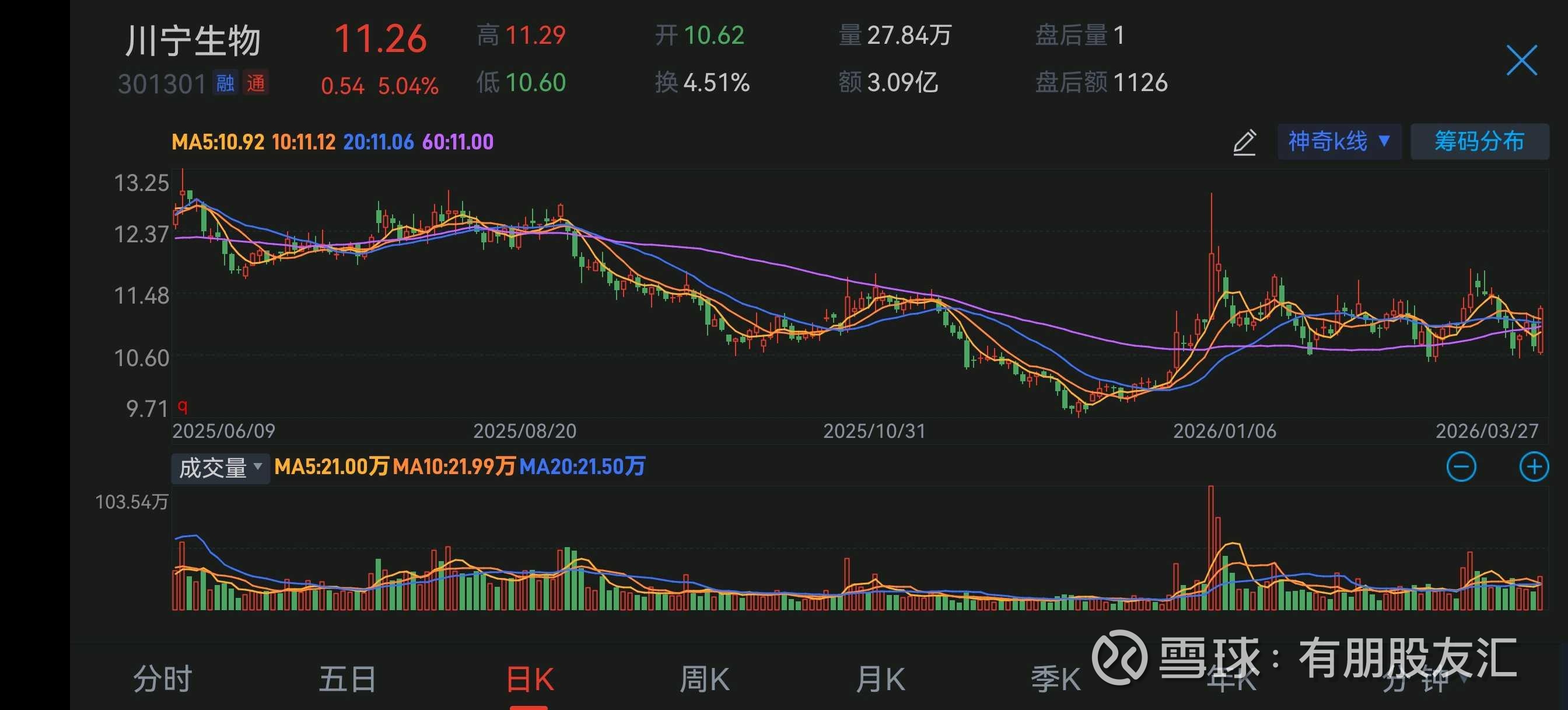 核心摘要: 川宁生物现价 11.26元,日涨幅 5.04%,以一根放量阳线突破了 11.00元 附近的长期均线压制。当前股价正运行于所有常用均线之上,趋势结构初现曙光。然而,突破的有效性需要未来1-3个交易日的量价配合来确认。趋势交易者此刻应做好两手准备:既不错失潜在的趋势起点,也不盲目追高陷入假突破陷阱。