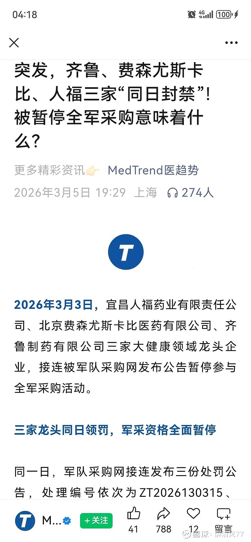 $国药现代(SH600420)$ 被暂停全军采购意味着什么?被暂停全军采购资格,简单的逻辑就是相关企业失去了这个重要的千亿级采购市场。军队采购覆盖陆、海、空、火箭军及武警部队所有物资、工程、服务需求。医药领域涉及战伤急救、麻醉镇痛、临床营养、血液制品等刚需品类。资格暂停后,现有供货合同终止,未来订单归零,存量市场份额被竞争对手迅速瓜分。麻醉药等药品需求量最大的军队系统其是供应不了了,他有的麻醉产品目前只有国药现代能替代补上,这反而给了现代瓜分其麻醉市场,弯道超车的机会!