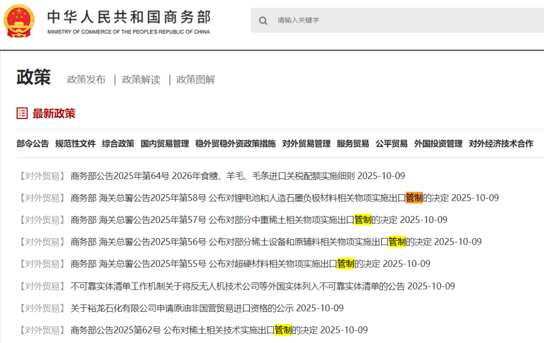 昨天(10月9日)商务部在官网发布了多份出口管制的决定,涉及中重稀土、稀土设备和原辅料、超硬材料、锂电池和人造石墨负极材料相关物项实施出口管制。