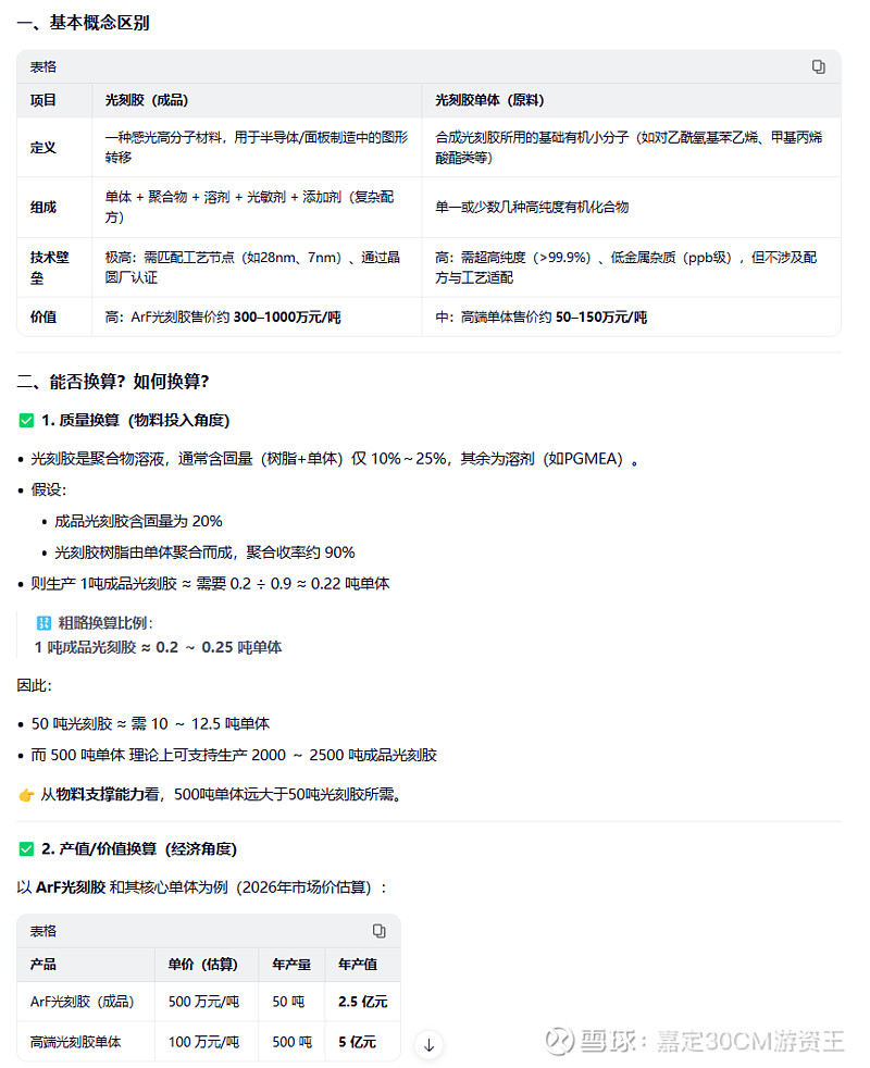 $佳先股份(BJ920489)$ 看到下面有人讨论产能问题,但其实有本质区别,佳先股份产收购的新公司年产值是1000吨光刻胶单体,目前产值是500吨一年。南大光电产值是50吨一年的光刻胶。所以我AI一下进行了换算。佳先这边按500吨一年产值出来的光刻胶单体,理论上来说可以搞出2000-2500吨的光刻胶。所以潜力还是无穷的。