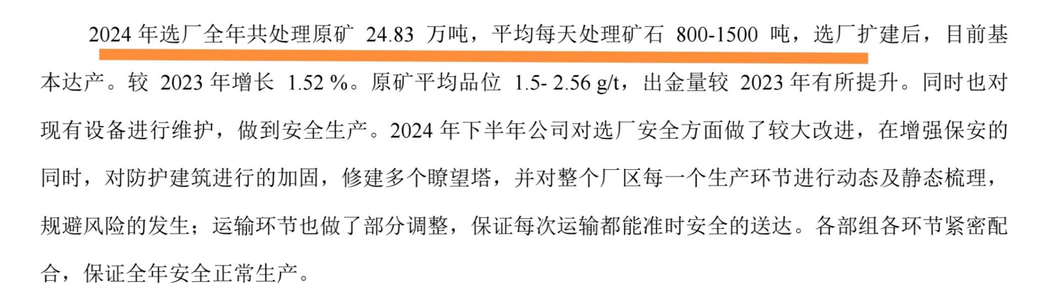四、选厂仍有很大潜力。2024年处理矿石24.83万吨,按一年300个工作日计算每天处理矿石约为800吨,如果充分发挥1500吨/天的处理能力,黄金产量还可以增长80%。