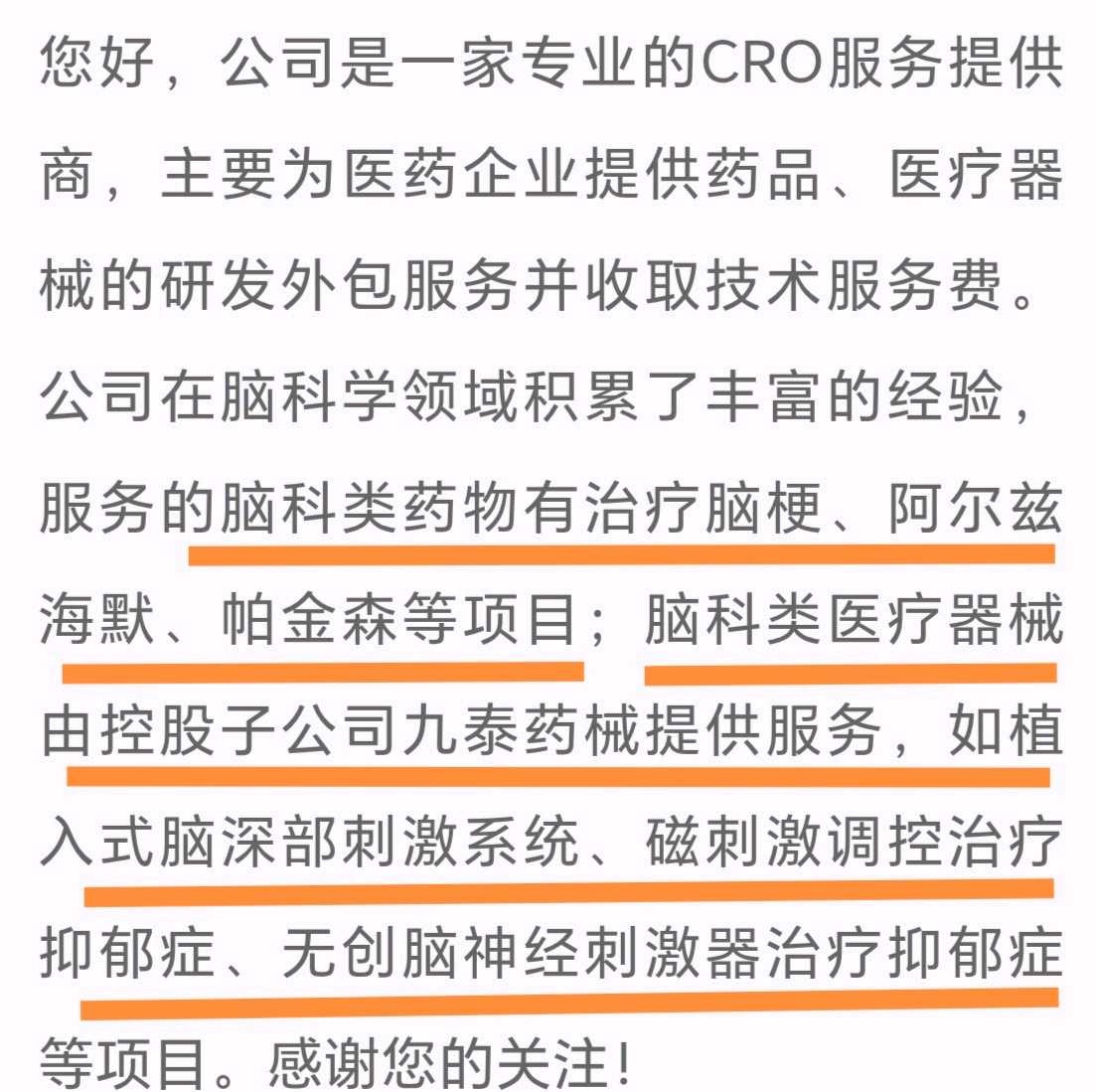 专业子公司协同。控股子公司九泰药械作为专注于医疗器械第三方外包服务的CRO公司,在脑神经科学领域的医疗器械临床研究方面具有丰富经验,已为植入式脑深部刺激系统、磁刺激调控治疗抑郁症等脑神经科学方面的医疗器械提供临床研究服务。虽然公司表示目前暂无脑机接口领域相关的项目,但其技术储备与服务能力已为切入这一市场做好充分准备。