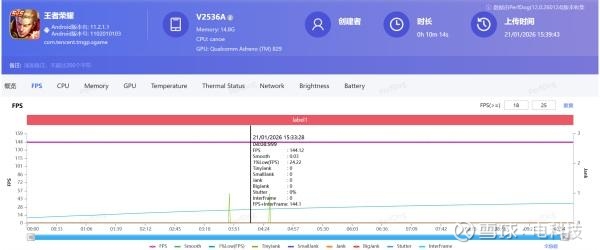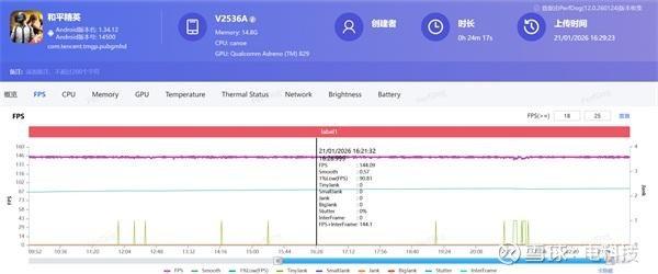 电科技首先测试了《王者荣耀》,得益于iQOO x 《王者荣耀》联合实验室的深度联合调校,在室温环境下,iQOO Z11 Turbo在实际的对局中能够保持144帧满帧运行,实际游戏过程中没有出现明显的画面大幅度波动掉帧情况。