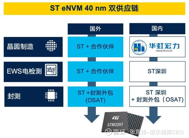 据ST介绍,在前端晶圆制造环节,意法半导体与华虹宏力已经有了长达十五年的合作历程。以此为基础上,ST和华虹在2024年底宣布,双方将进一步深化了双方的长期合作伙伴关系。具体而言就是华虹采用与意法半导体全球晶圆厂完全一致的40纳米嵌入式非易失性存储器(eNVM)技术和质量管控标准,确保本地制造的产品在质量和兼容性上与意法半导体全球标准无缝衔接。