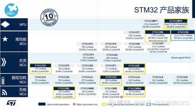 因为自2007年首款STM32F1诞生以来,这系列历经19年演进的微控制器已成为全球通用MCU当之无愧的市场冠军。迄今为止,ST也已推出超4000种型号MCU,打造了覆盖“入门级到高性能”的超低功耗MCU、主流MCU、高性能MCU、无线MCU与微处理器(MPU)五大核心系列全维度产品矩阵。