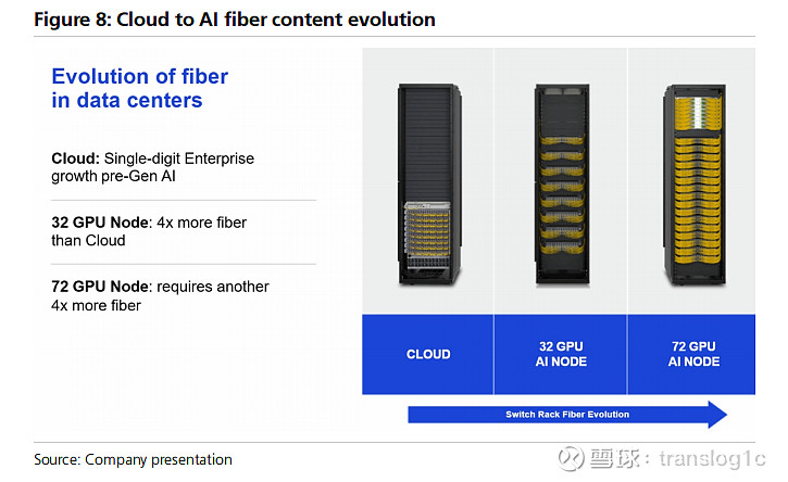 光纤TAM继续扩大:“我们构建的GPU/服务器内容表明,数据中心建设所需的纤维内容增加了4至16倍,随着向下一代处理器发展,这一需求将进一步增加。GLW正在与企业签订合同,以连接校园内和远距离的数据中心。从长远来看,共封装光学(CPO)开始带来额外的2至3倍内容提升。GLW是领先的光纤生产商,并在前沿领域拥有竞争优势,其创新将40%至80%的额外线缆集成到现有基础设施中。我们对数据中心资本支出与密度的独特分析,支持了我们对GLW光学部门收入在2029年前实现约24%复合年增长率的预测。光学利润目前约占GLW的40%(相较于10年前的约15%,正在增长至超过50%),这使得光学增长成为更显著的驱动因素(显示部分占比从约60%下降至约35%)”