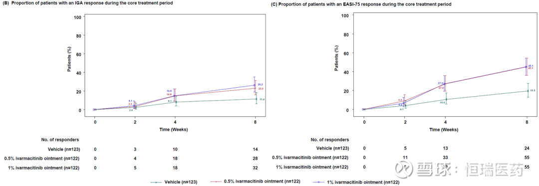 ● 在核心治疗期间,0.5%和1%艾玛昔替尼软膏组在每个访视点达到IGA和EASI 75应答的患者比例均高于赋形剂组,从基线至第8周有明显改善。