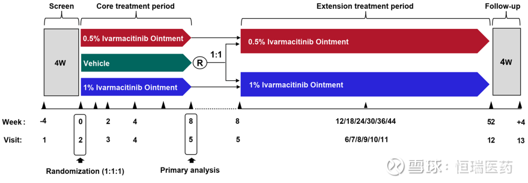 主要纳入年龄18~75岁的成人患者,需符合Hanifin和Rajka标准,确诊为轻中度AD;体表受累面积(BSA)为3%~20%;湿疹面积和严重程度指数(EASI)评分≥5分;研究者总体评估(IGA)评分为2分或3分。受试者以1:1:1的比例随机分配,分别接受每日2次的0.5%艾玛昔替尼软膏、1%艾玛昔替尼软膏或赋形剂治疗。治疗8周后,完成核心治疗阶段且初始接受赋形剂治疗的患者进入扩展阶段,按1:1比例随机分配至0.5%或1%艾玛昔替尼软膏组继续治疗;原活性药物治疗组患者则维持原方案,持续治疗至第52周。