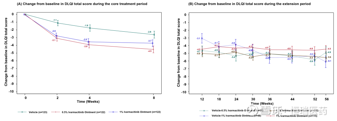 图5 核心治疗期和扩展期DLQI总分相对于基线的变化