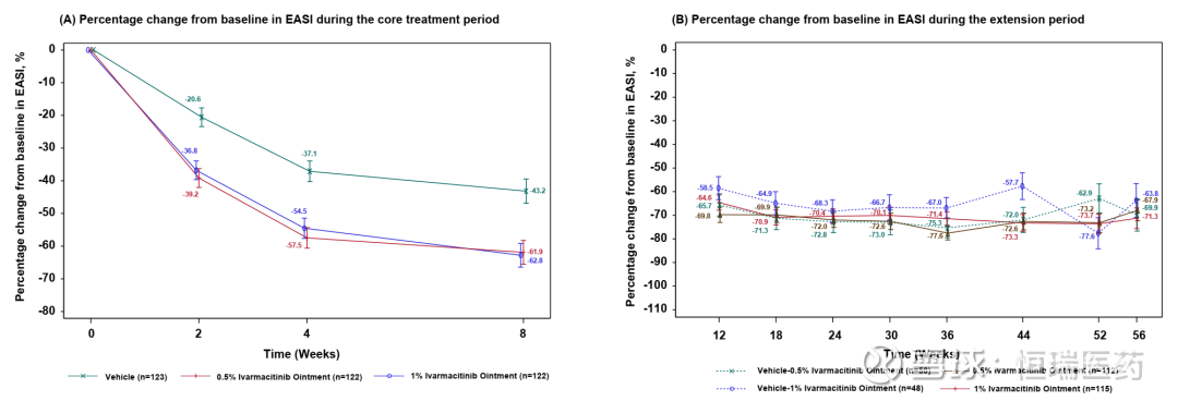 图4. 核心治疗期和扩展期EASI评分相对于基线的变化百分比