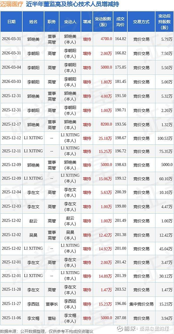 2026年3月31日,迈瑞医疗公布了史上最差的年报。当天,迈瑞董事、高级副总经理郭艳美、副总经理李朝阳再次买入公司股票。迈瑞医疗近半年内的董监高及核心技术人员增减持详情如下: