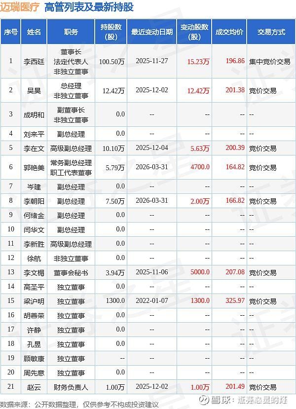 截止发文,迈瑞医疗的高管列表及最新持股情况如下:
