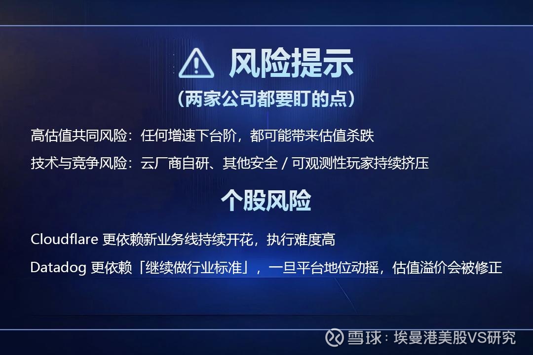 3)公司自身执行风险新产品落地效果不及预期: 对 NET,Workers / AI 等新方向如果难以形成规模效应或生态优势,重资产投入与回报之间的平衡会承压;对 DDOG,安全和 ITSM 相关产品若没有形成与核心 Observability 的良性协同,可能增加复杂度而非显著提升平台价值。