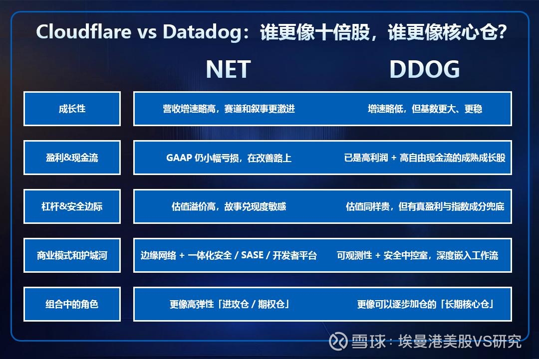 3. 在经营质量和自由现金流维度上,DDOG 的成熟度更高,更接近很多人心目中的「核心仓候选」;NET 则在网络与新产品上的再投入更重,承担的是更高波动与更大想象空间的组合角色。