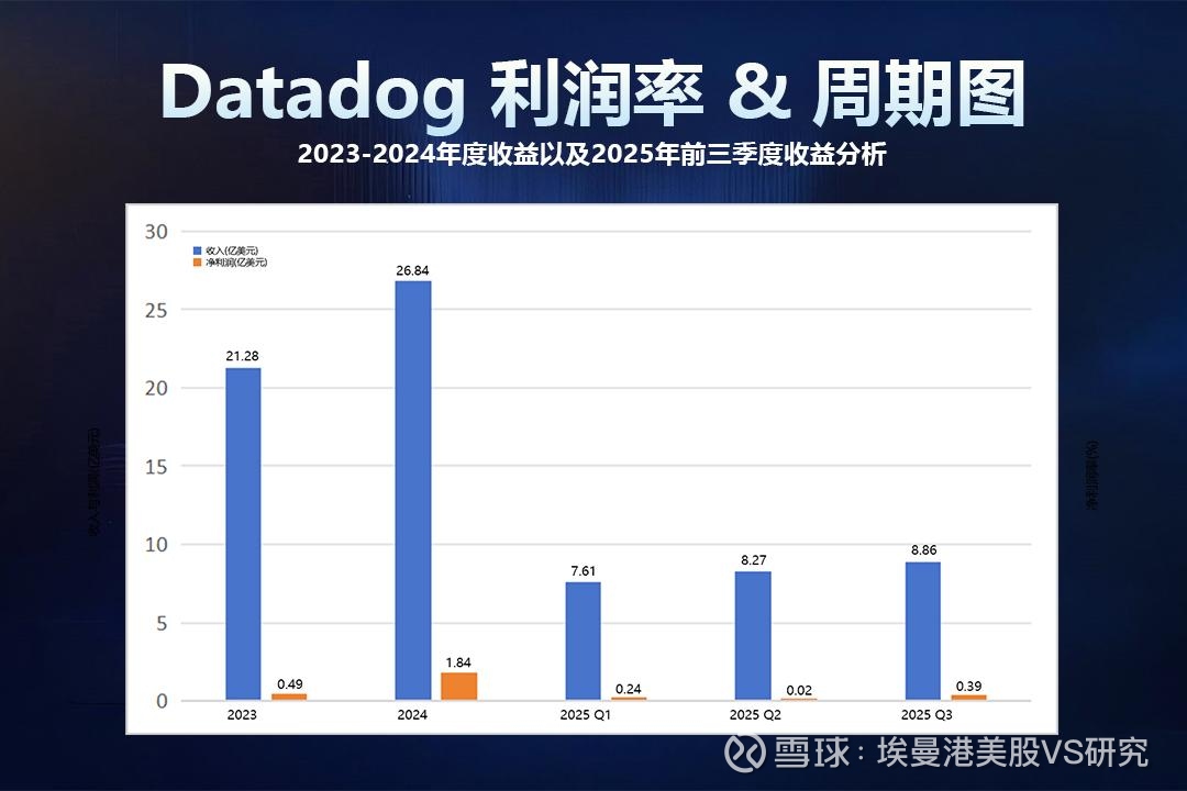 1)Datadog:更接近「核心仓候选」在经营质量、自由现金流、平台粘性这些维度上,Datadog 的特征更接近很多人心目中的「核心仓候选」: 收入体量、增速和盈利成熟度呈现出相对均衡的组合;