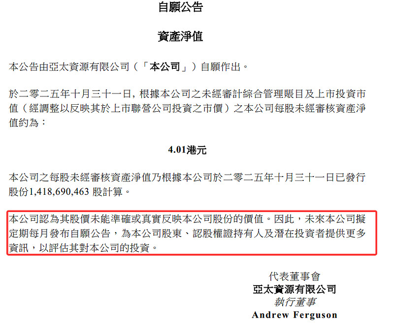 $亚太资源(01104)$ 本公司認為其股價未能準確或真實反映本公司股份的價值。因此,未來本公司擬 定期每月發布自願公告,為本公司股東、認股權證持有人及潛在投資者提供更多 資訊,以評估其對本公司的投資。
