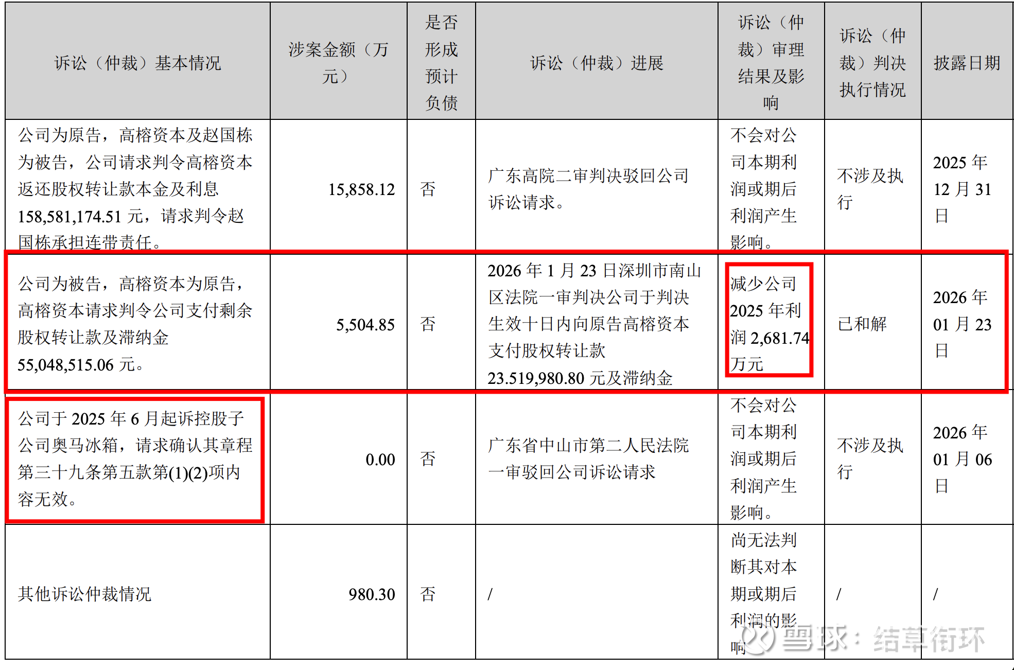 (1)与高榕资本股权转让纠纷:TCL 智家于 2026.02.05 支付上述 2681.74 万元,进行和解,该笔损失计入了2025年第四季度,对四季度利润产生了一定影响,已彻底了解。