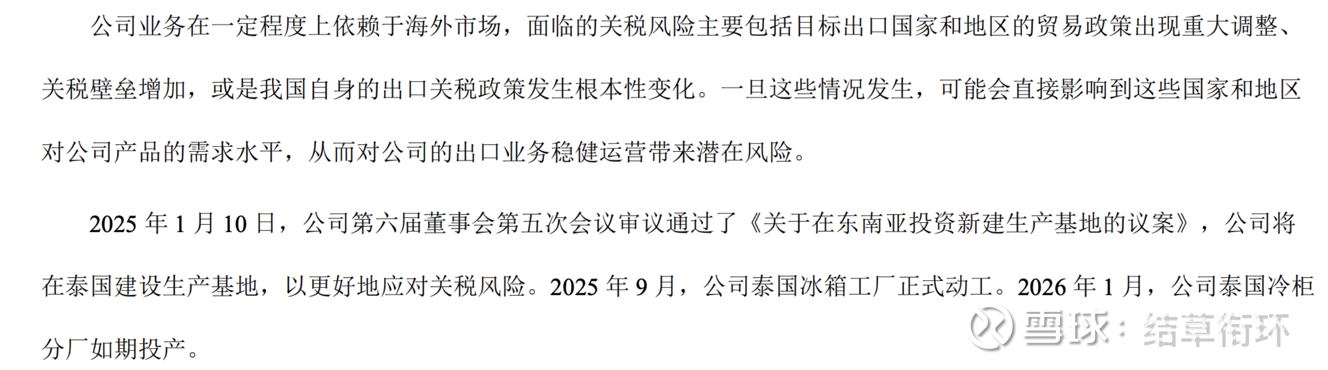 选择在泰国进行建厂,2026年1月泰国冷柜工厂已投产,可以有效对冲关税风险。