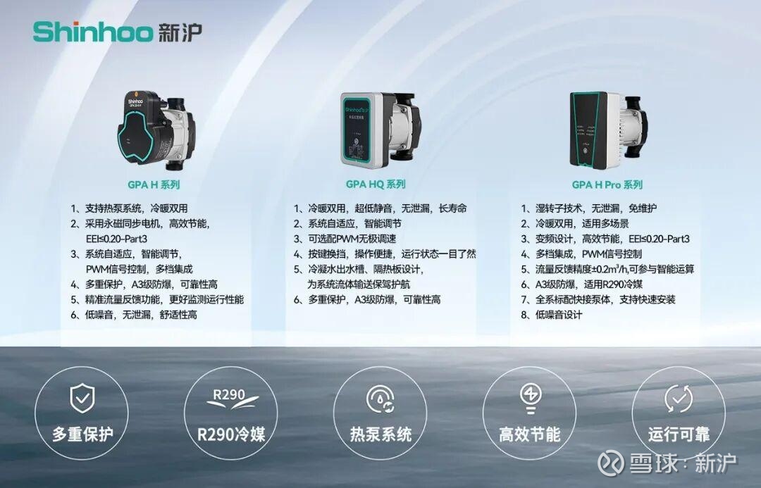 此次参展,新沪聚焦热泵行业核心需求,携多款热泵专用高效节能循环屏蔽泵明星产品亮相,涵盖GPA H Pro系列、GPA HQ系列等主力机型,全面展现其在热泵配套领域的技术积淀与产品优势。针对北方寒冷地区热泵系统冬季运行难题,新沪热泵专用循环泵可在-30℃严寒环境下稳定运转,同时适配R290等环保制冷剂系统,契合全球制冷剂替代趋势。搭载先进永磁同步电机,能耗较传统水泵大幅降低,具备无泄漏、低噪音、智能适配等优势,可广泛适配空气源、地源热泵及两联供系统,精准匹配建筑供暖、商业用热等多元场景需求。