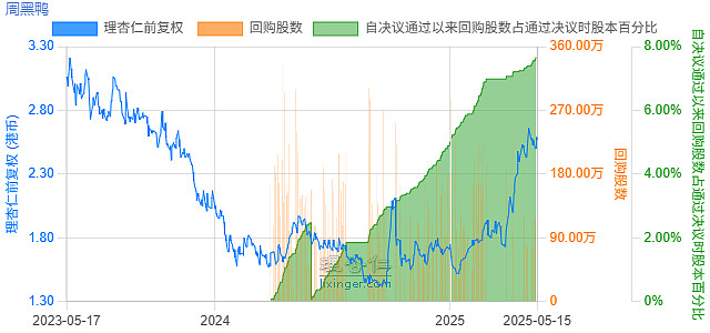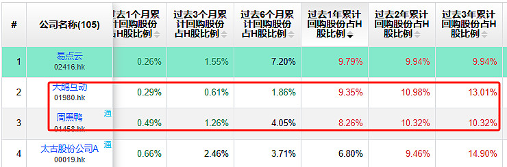 这回购力度在整个香港市场除了$天鸽互动(01980)$ ,周黑鸭排名第二。
