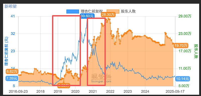 4. 从40开始下跌,一路跌到22的过程中散户大幅入场(股东人数大增)。