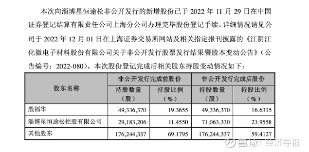 2022年11月29日,淄博星恒以每股15.43元、共计约6.46亿元认购江化微向特定非公开发行的4188.01万股股票,加之前述股份,淄博星恒共持有江化微7106.33万股股票,占总股本的23.9558%,成为控股股东。