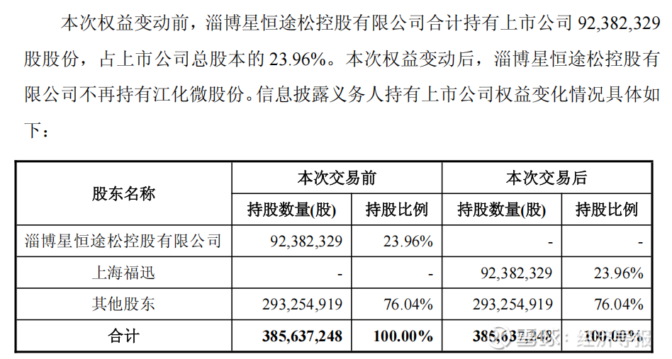 江化微称,本次股份转让不会影响公司的正常经营,若交易顺利完成,公司控股股东将由淄博星恒变更为上海福迅,实控人将由淄博市财政局变更为上海市国资委。