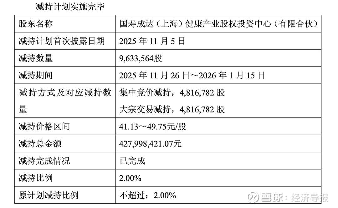 近日,华熙生物公告称,截至2026年1月15日,国寿成达以集中竞价方式减持公司股份481.68万股,以大宗交易方式减持公司股份481.68万股,合计减持公司股份963.36万股,减持总金额为4.28亿元。减持完成后,国寿成达的持股比例降至4.01%。