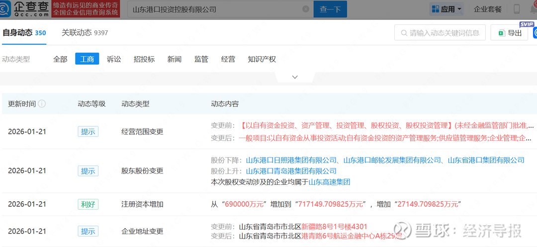 企查查显示,日前,山东港口投资控股有限公司(下称“山港投控”)发生多项工商变更,包括注册资本增加、股东股份变更、经营范围变更等。