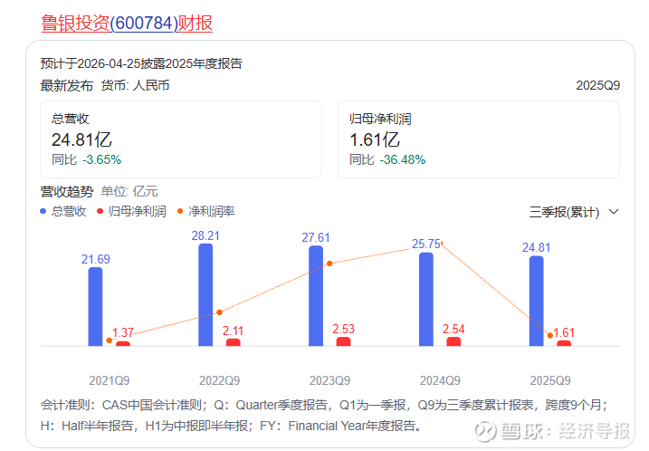 财报显示,鲁银投资2025年前三季度营业收入为24.81亿元,同比下降3.65%;归母净利润为1.61亿元,同比下降36.48%;扣非归母净利润为1.54亿元,同比下降37.75%;基本每股收益0.24元。