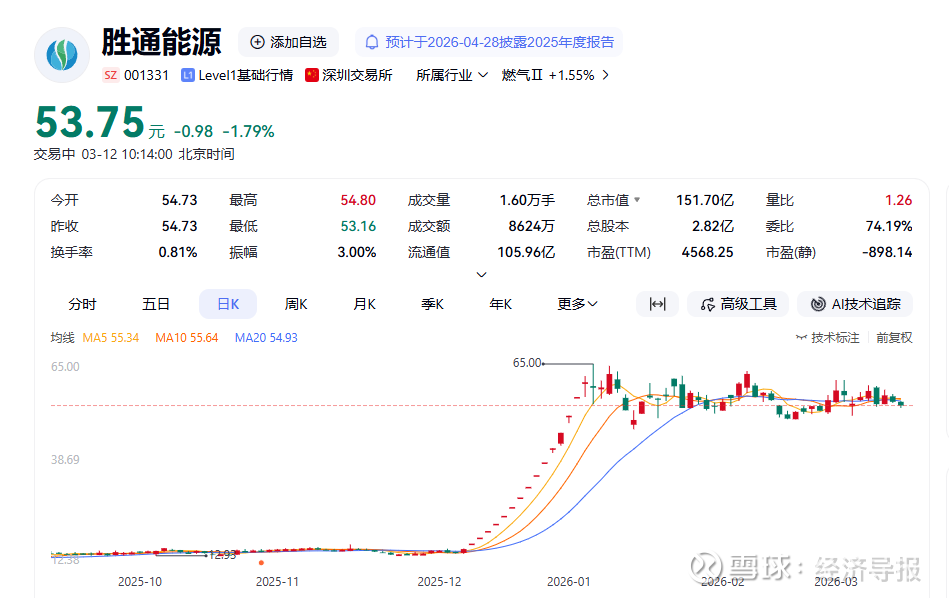 经济导报记者注意到,从2025年12月12日至2026年3月11日,胜通能源累计出现15个涨停板,股价更是从2025年12月4日收盘价14.75元/股涨至2026年3月11日收盘价54.73元/股,涨幅达271.05%,市值亦从41.63亿元攀升至154.47亿元。