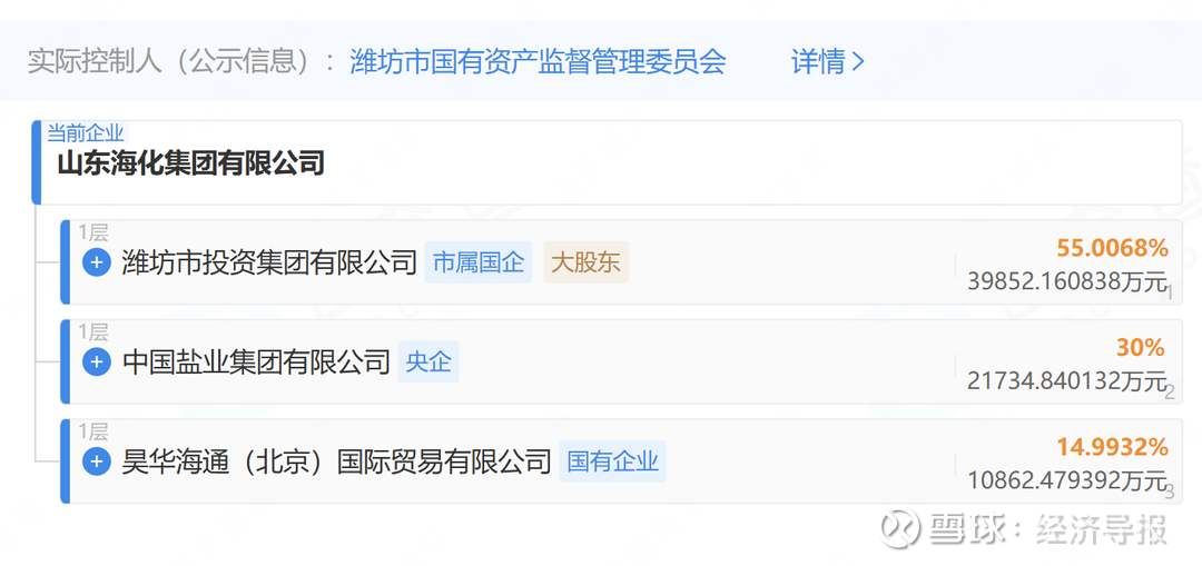 山东海化集团股权结构显示,潍坊市投资集团有限公司持有其55.0068%的股份,为公司控股股东;中国盐业集团有限公司持股30%,为第二大股东;剩余14.9932%的股权由昊华海通(北京)国际贸易有限公司持有。股权穿透,公司实际控制人为潍坊市国有资产监督管理委员会,综合持股比例为51.28%。
